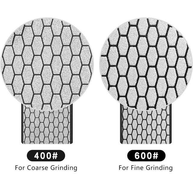 - Груба заточка (400 Grit): ефективна для відновлення сильно зношених лез. Поверхня з алмазним напиленням виконана у вигляді бджолиних сот, що забезпечує якісну роботу і ефективне відведення стружки.