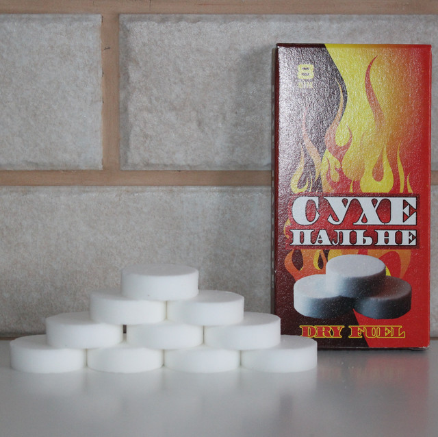 Застосування: сухе пальне розкладають на негорючу поверхню й підпалюють, за потреби підкладають нові таблетки.