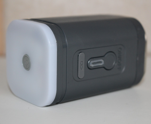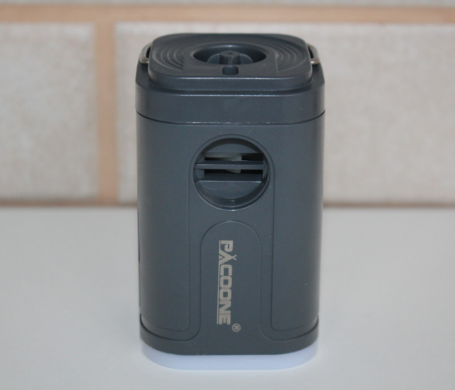 Насос має компактний розмір і керується однією кнопкою вмикання/вимикання, яка розташована на звороті отвору для забору повітря. Окрема кнопка для ліхтарика знизу.